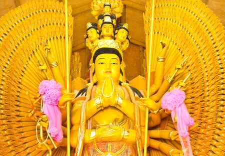 Wooden Guanyin buddha statue with thousand hands in Thailand