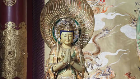 Buddha statue. Buddhist sculpture. images of chinese buddha in Singapore temple. Buddha Tooth relic temple China town which has statue of Cintamanicakra Acala Manjushri Maitreya and Samantabhadra.