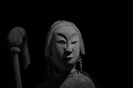 Buddhist religion and meditation. Kannon or Guanyin, the Goddess of Mercy, wooden statuettes on black background (Black and White with copy space)