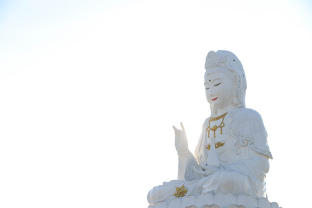 White GuanYin statue on sky background in temple at Thailand, Religion concept, isolated on white background