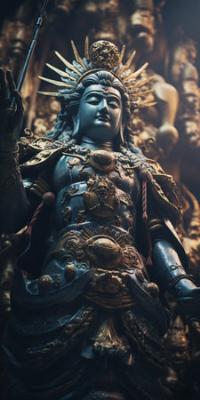 A majestic statue of a goddess stands against a vibrant blue sky. This colorful sculpture showcases intricate details and reflects deep cultural heritage and spirituality.