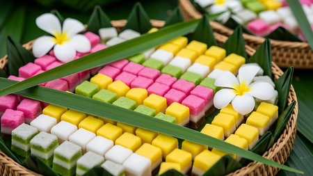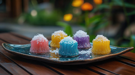 A stunning arrangement of colorful Thai desserts presented beautifully on a brass plate. Delight in the vibrant colors of edible flowers and tropical leaves.