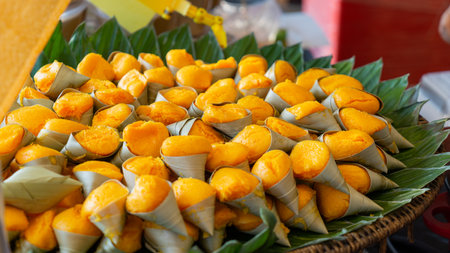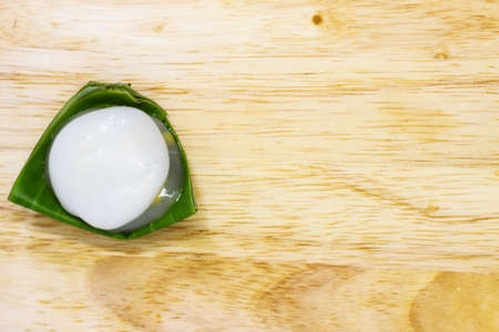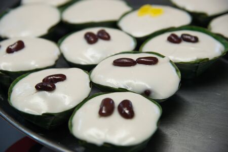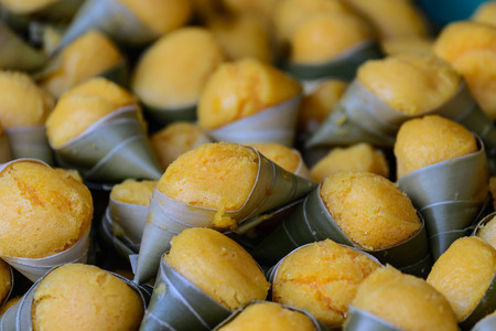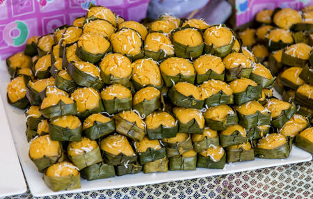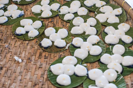A type of Thai dessert It has a soft, fluffy texture wrapped in banana leaves. Eaten with grated coconut to enhance its sweet taste. Beautifully arranged in a wicker basket tray.