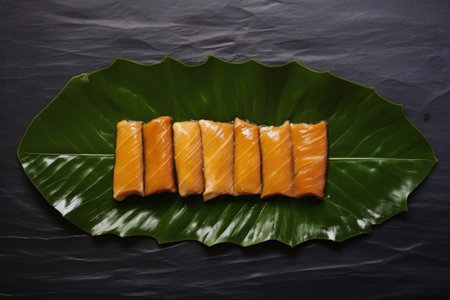 aerial view of smoked cod arranged on a green leaf, created with generative ai