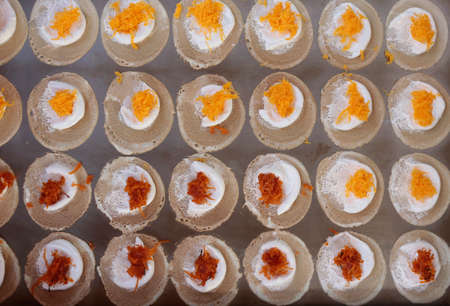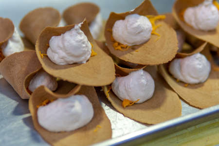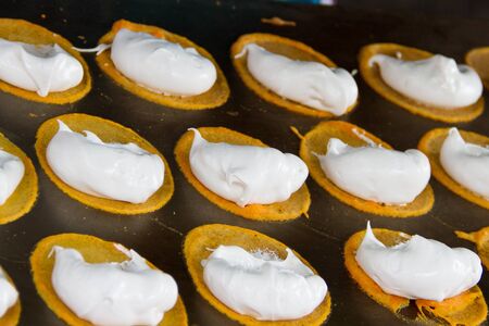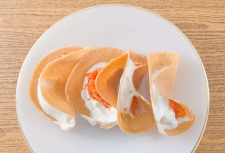 Thai Traditional Snack and Dessert, Top View of Thai Crispy Pancake or Thai Crepes Filled with Sweet Coconut Cream and Salted Shredded Coconut.