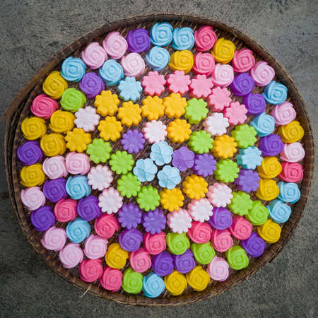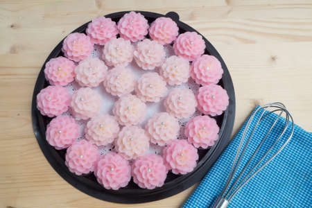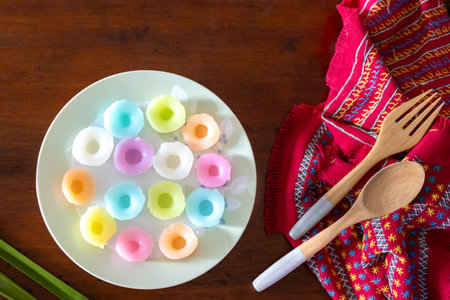 A close-up of Floral rice cakes or Thai jasmine-scented sweets on the wooden table, a traditional Thai dessert. Top view. Flat lay.