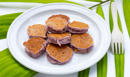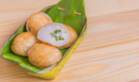 Thai style Sweet and Savory Grilled Coconut-Rice Hotcakes dessert in banana leaf plate on wood table.