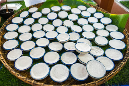 Traditional Thai Khanom Alua dessert in soft pastel colors, served in banana leaf cups. Delicate Asian sweet snack and cultural confectionery artistry.