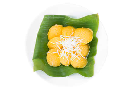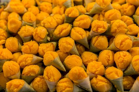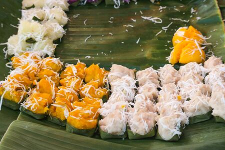 Sweet Shrimp and shred coconut on yellow sticky rice, Traditional Thai local desserts wrapped in banana leaf