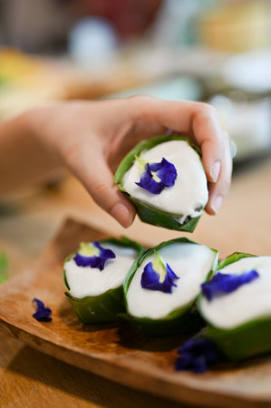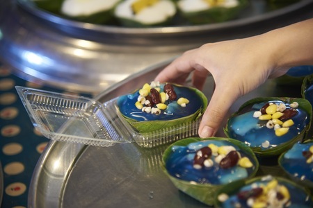 Hand picking coconut pudding with blue jam and beans topping in banana leaf cup