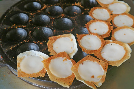Freshly cooked Kanom Krok, Thai coconut milk bite-size pancakes which crispy edge and creamy inside