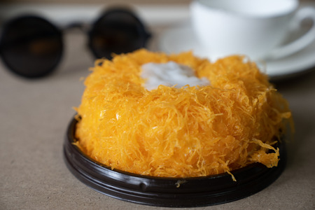 Traditional Thai desserts sweet and delicious : Golden egg strip is Thai desserts made from eggs on wooden background ( Thai name is Foi Thong).