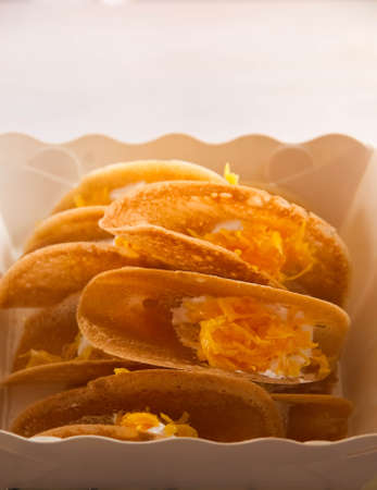 Thai Cake Traditional on plate.Kanom Kai. dessert snack original style Thai. Cake jam orange and cream homemade breakfast bakery. tasty and sweet food. hight sugar and hight fat. free space,flat lay.
