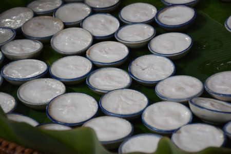 A delightful assortment of Thai coconut cream puddings, perfect for those who love sweet treats in charming mini cups.