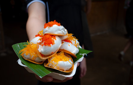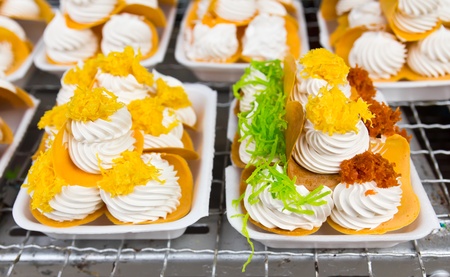Khanom Bueng. White cream made from egg whites mixed with sugar, beaten until smooth like whipping cream. Garnish with foi thong or fried shredded shrimp, a traditional Thai dessert. Popular snacks