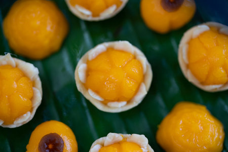 Traditional Golden Thai Dessert; JaMongKut, ThongAek are set on banana leaf.