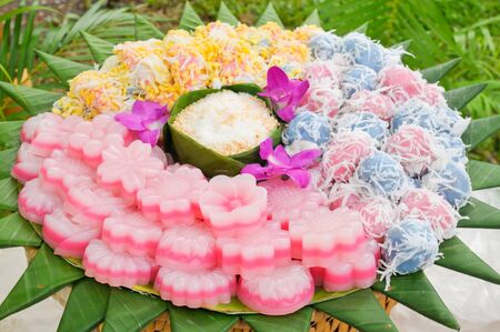 Mix of Thai Dessert including Soft mung-bean crepe, Steam Layer Sweet Cake (Kanom Chan) and Coconut Ball or Kanom Ko. Traditional Thai Dessert