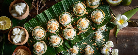 Delight in the beauty of traditional Asian steamed coconut cake presented in charming leaf cups, showcasing a rich texture and fresh ingredients, perfect for any occasion.