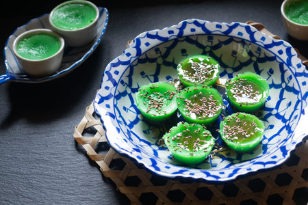 Asian food concept Thai alkaline pandan rice cake in thai pattern ceramic plate on black background with copy space
