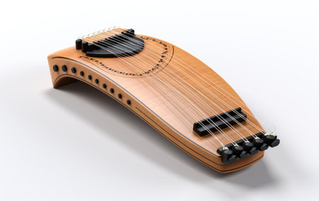 the zither, a traditional asian stringed musical instrument, sits elegantly against a pristine white background, showcasing its intricate frets and tuning pegs, evoking a sense of cultural heritage and artistic expression, perfect for music enthusiasts and photography lovers alike. ai generated