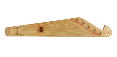 Top closeup horizontal studio shot of vintage, old wooden zither isolated on white background. Detail of zither mechanics and tuning pins. Dusty and scratched musical instrument.