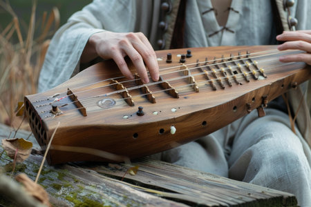 A musician's hands gracefully move across the strings of a traditional wooden zither, creating a beautiful melody in a serene outdoor setting.