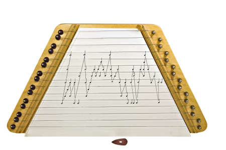 A small Dulcimer with music and a pick isolated on white.