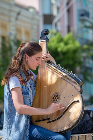 KIEV, UKRAINE - MAY 05, 2018 : Ukrainian girl playing the harp on the street of Kiev for passersby, Ukraine