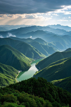 Experience a breathtaking view of misty mountains at dawn, showcasing layers of blue hues and soft light. This serene landscape evokes feelings of tranquility and adventure.
