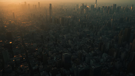 Aerial view of a sprawling cityscape at sunset with golden light reflecting off skyscrapers