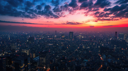 Dramatic cityscape of city at sunset with night lights and skyscrapers.