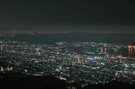 Nagasaki night panorama, Japan, aerial view, city skyline, port and mountains, seen from Inasa mount, Inasayama park, city illumination, Nagasaki prefecture, Kyushu island region, ropeway cable car