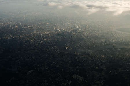 Bangkok city's bird eye view shot from a plane that flight in a morning with warming color of sunrise and some shade from clouds