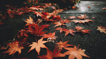 A close-up view presents various maple leaves scattered across a dark, textured surface. The leaves display hues of red and orange. The composition suggests an outdoor setting, potentially a walkway. This image is suitable for a range of commercial or editorial applications related to seasonal themes.