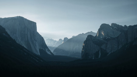 Misty mountain landscape soft fog hues embracing towering peaks in nature s serenity