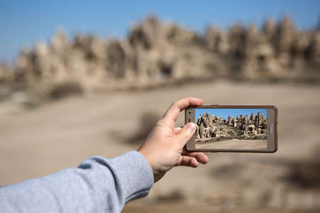 Hand with a phone on the soft background of the rock formation and the blue sky with clouds. On the phone display there is an image of houses carved into rock.