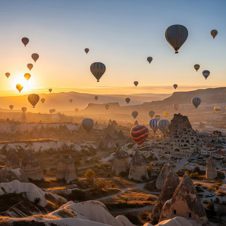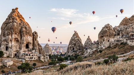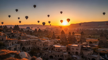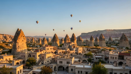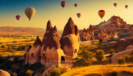 Views of Cappadocia, hot air balloons at dawn against the backdrop of tuff mountains and cave houses