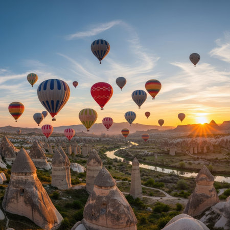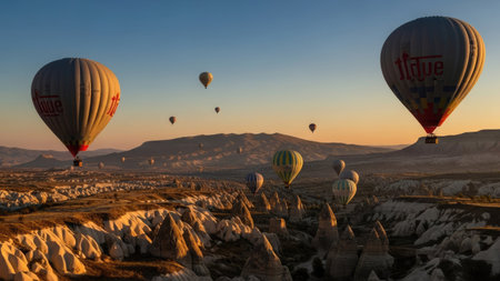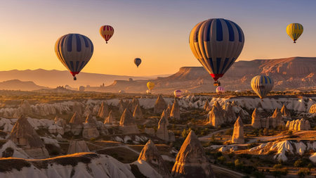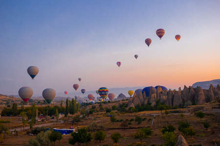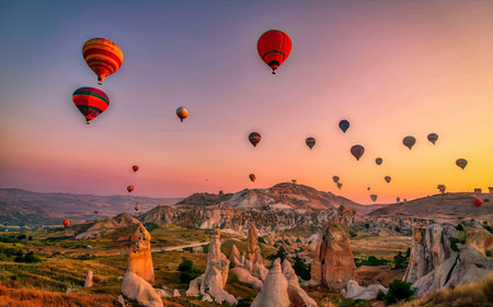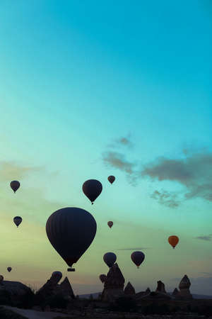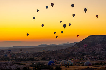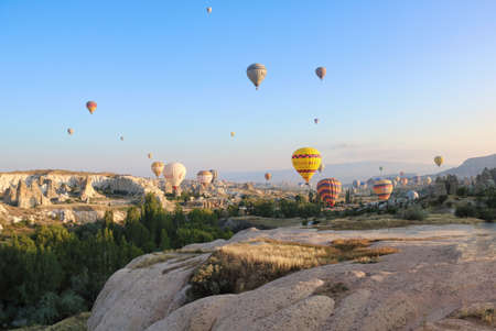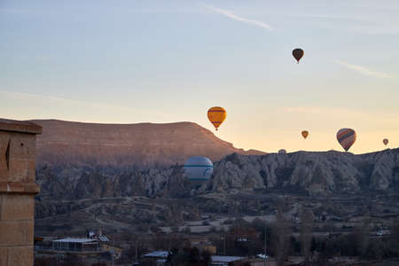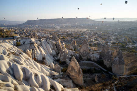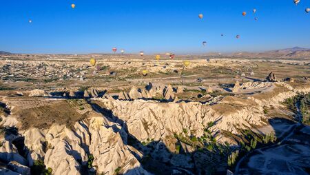 Goreme, Turkey - October 15, 2016: Hot air balloons flying over valley of Cappadocia at sunrise. Nevsehir Province