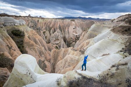 Adventurous person with spreaded hands is stadning on the rock and enjoying the panorama of Cappadocia. Travel destination in Turkey.