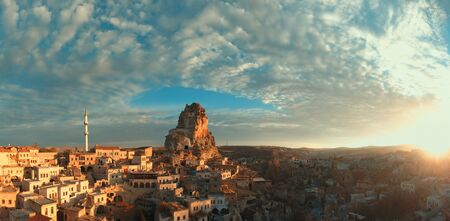 Aerial view on Goreme town in Cappadocia during sunset. Landscape of city.