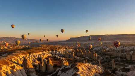 Hot air balloons flying over the famous landscape of Cappadocia, Turkey