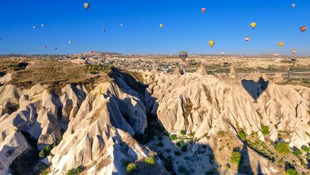 Goreme, Turkey - August 31, 2019: group of hot air balloons flying at down in cappadocia to admire rock formations in summer, Turkey, copy space