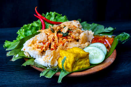 Nasi Bakar, Indonesian traditional food, filled with sliced chicken, decorated with cucumber, fried tofu, and chili sauce