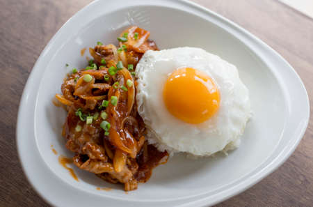 Stir-fried pork with garlic on topped rice with egg - Asian food style