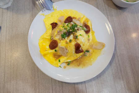 omelette rice topping with Chinese sausage and Vietnamese pork sausage on white dish