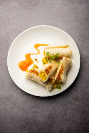 Indian paneer bread roll made using spiced grated cottage cheese mixed with spices & rolled & baked