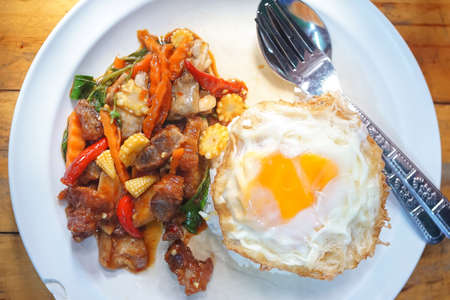 Stir fried Crispy pork with chili and holy basil eat with steamed rice and fried egg