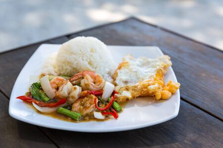 Rice topped with stir-fried shrimps and basil Thai style ( Kra prao gai ) on wooden table