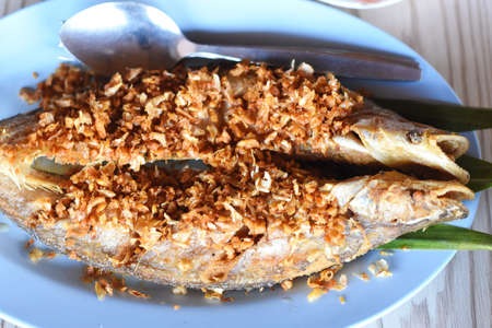 Thai crispy deep fried small fish with garlic and pepper.This would be served as a starter or tapas in local Thailand, Spicy Seafood Asian Dish
