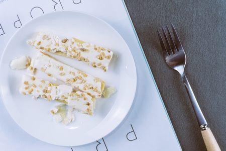 Natural dental treats for dogs. Chew Treats. Dried beef tendons on a two-color background. Flat Lay.